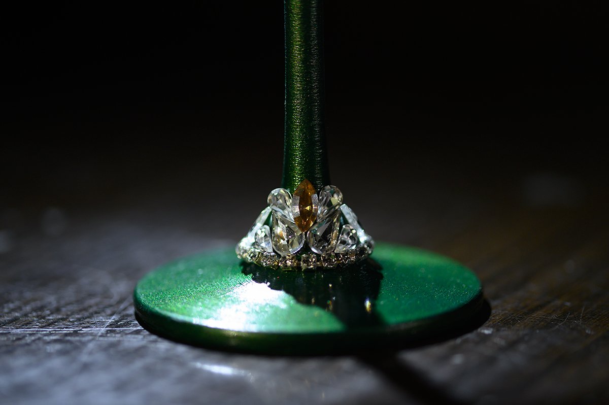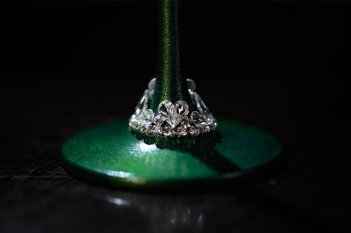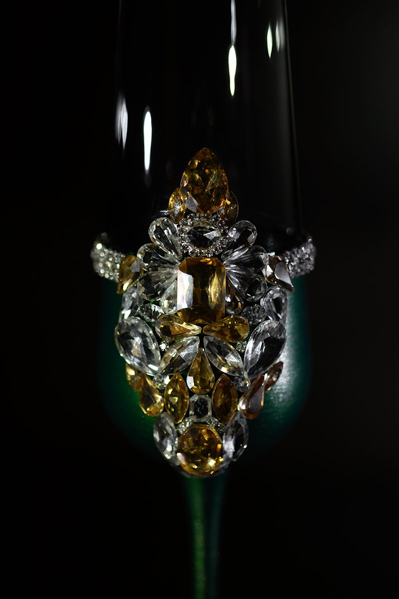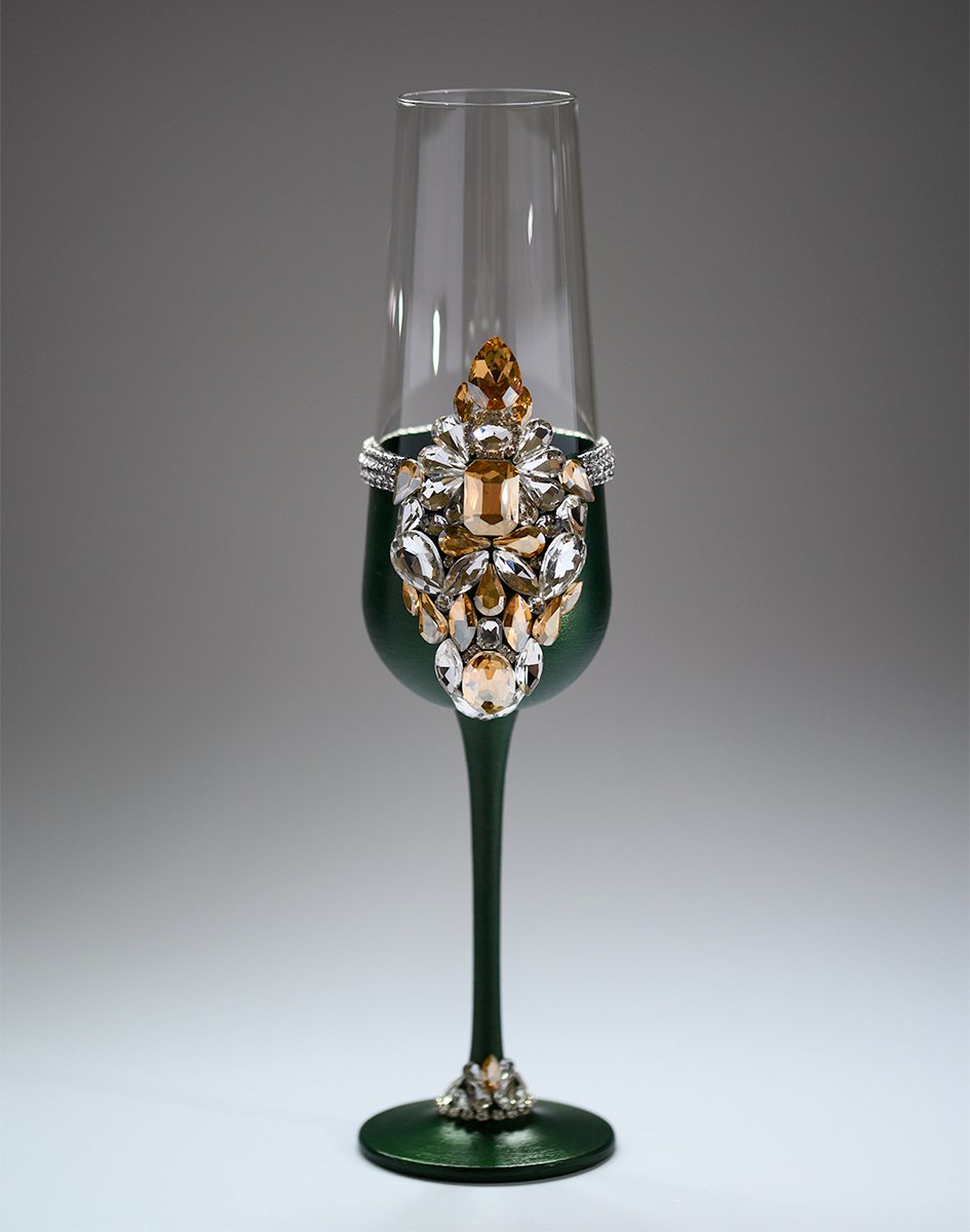 Deep green, golden shimmer, and jeweled crystal detail – the Monarch Green Flutes are designed to toast with majesty.