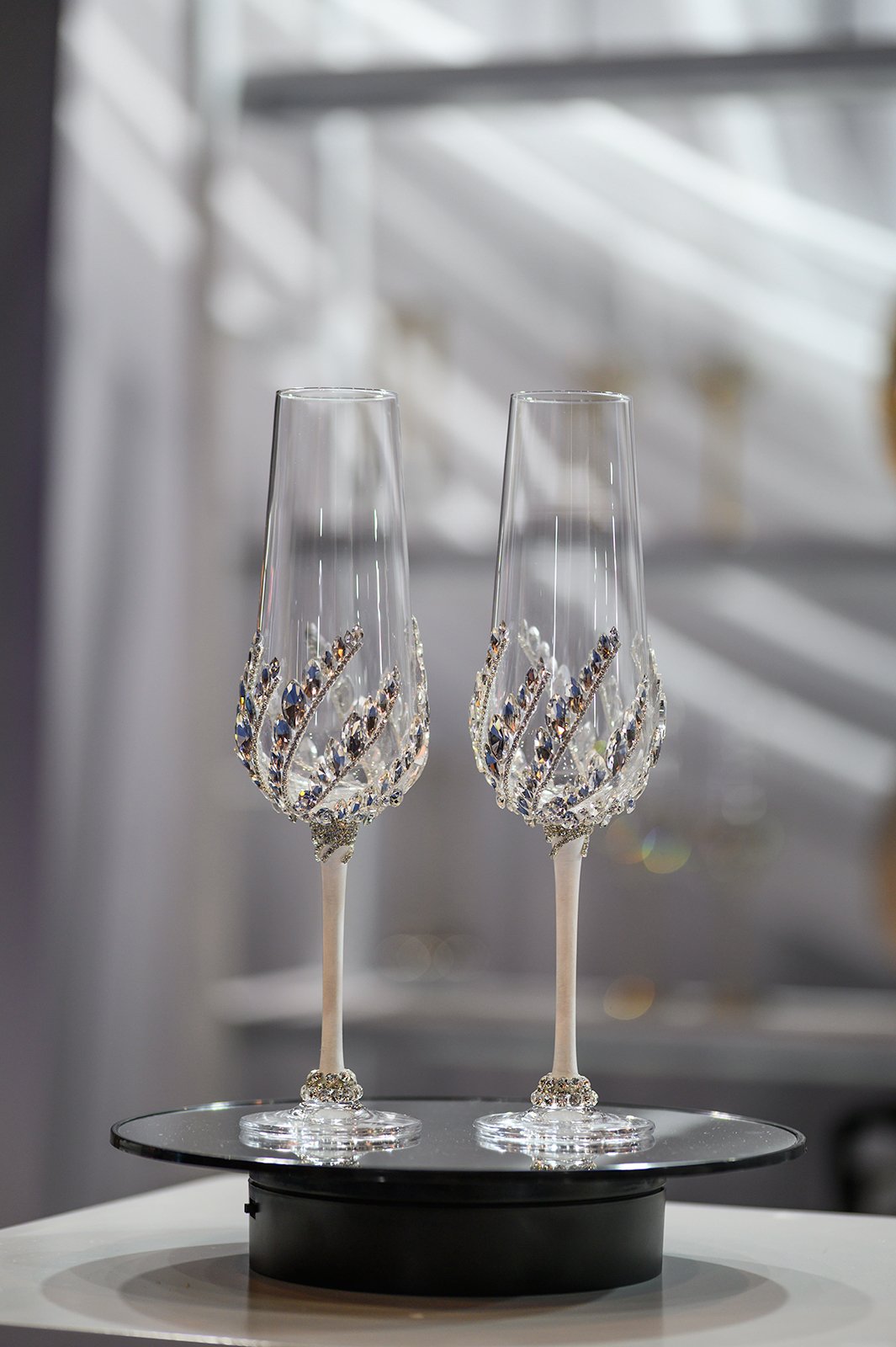 The Seraphine Flutes are a celebration of elegance and light. Each glass is hand-decorated with crystal patterns that rise like wings, catching and scattering light with every movement.
